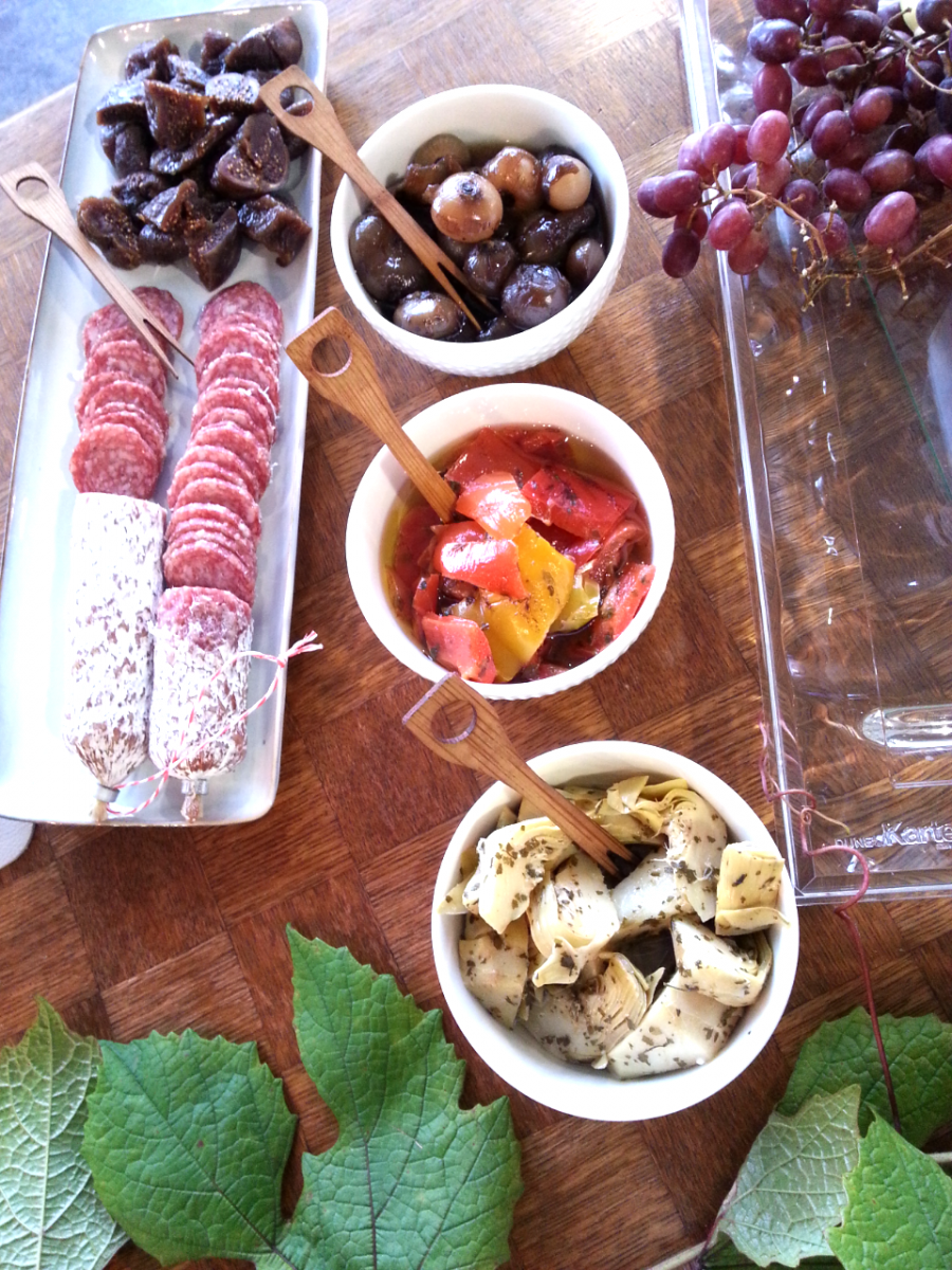 Asiakasiltamme teemana italialaisuus kantoi läpi koko kattauksen, siis myös tarjoiluja myöden. Italialaisia juustoja; parmegiano, grana padano, pecorino ja gorgonzola Nicolas Vahén viikuna- ja raparperihilloilla kyyditettynä. Antipastina artisokkaa, pieniä grillattuja sipuleita ja paprikoita sekä salamia. Makeana palana viikunoita ja cantuccini-keksejä sekä kuohuvana luonnollisesti Fiorellinon Extra Dry Proseccoa.