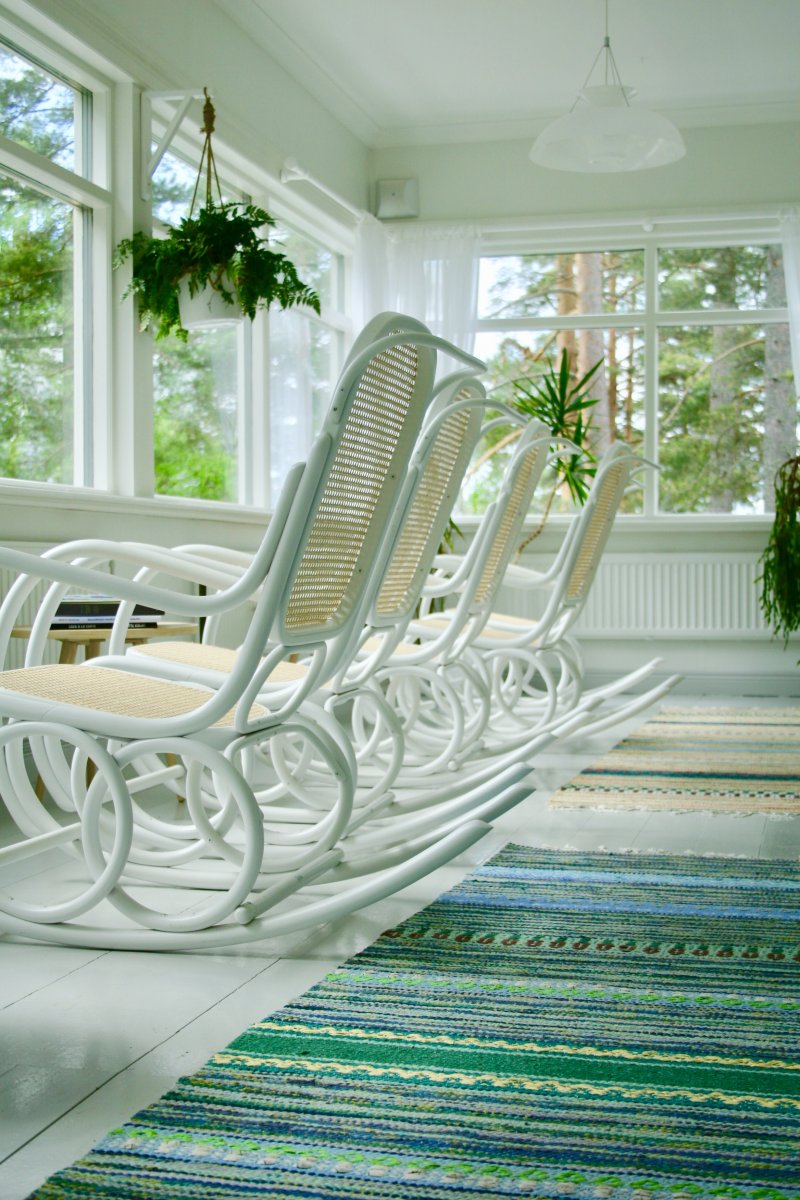 Kun tavarat oli pakattu otin vielä hetken itselleni. Riensin ruotsalainen sisustuslehti kainalossa hotellin päädyssä sijaitsevaan keinutuolihuoneeseen, ja rauhassa, auringonvalossa kiikkuen luin sen kannesta kanteen. Upea, valoisa lasiveranta oli tyhjä muista vieraista ja kaukana muu maailma. Nauratti. Voisikohan täältä varata jo oman kiikun vanhojen päivien varalle?